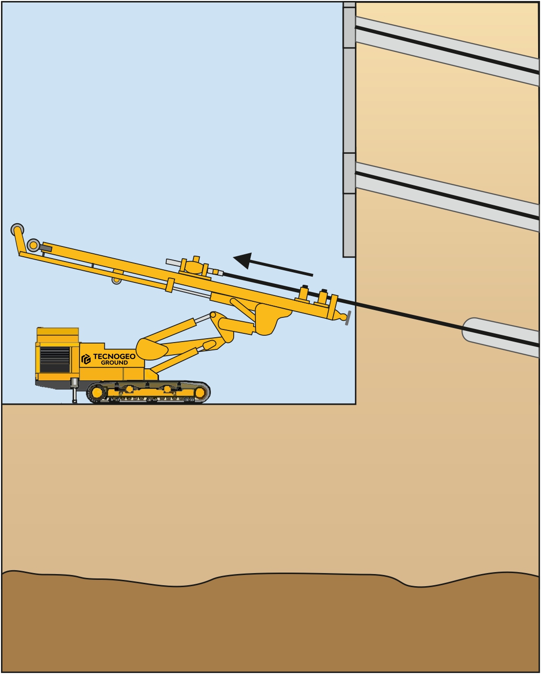 O solo grampeado é executado em faixas, divididas em trechos que são concluídos de forma alternada, evoluindo de cima para baixo até a estabilização total do maciço. As principais qualidades dessa tecnologia são sua agilidade de início por mobilizar equipamentos de pequeno porte, baixo custo, alta produtividade, facilidade de execução em locais de difícil acesso, adequação à topografia da superfície local, podendo ser aplicável em obras de grandes desníveis